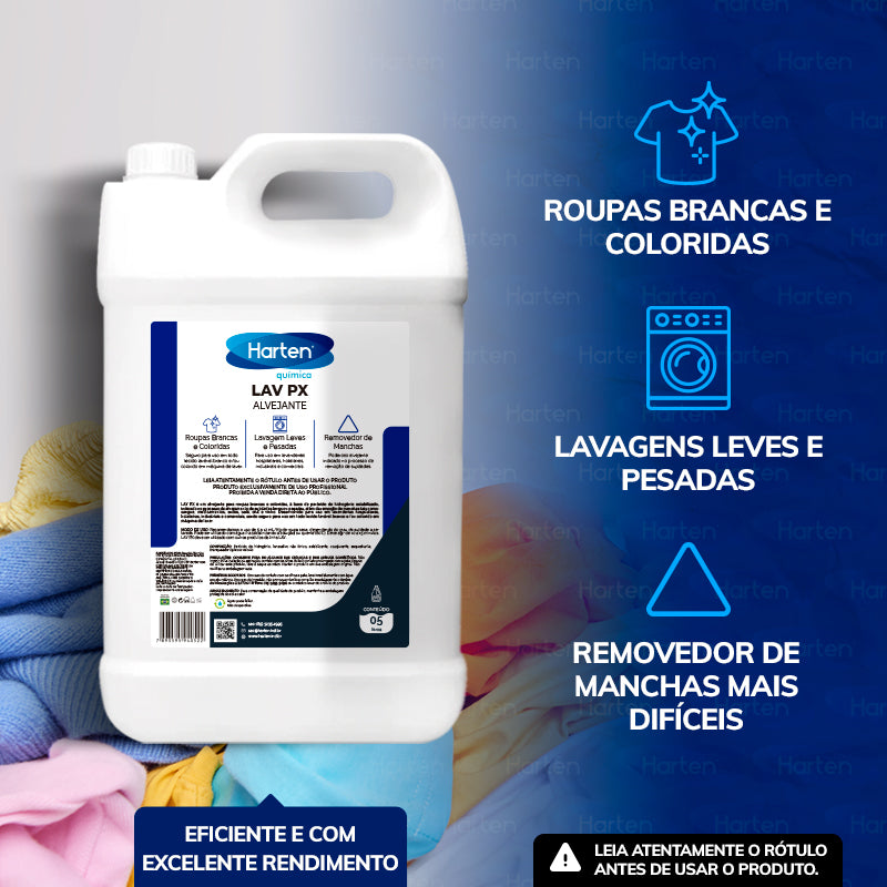 Modo de Uso: Para uso em lavanderias, adicione o LAV PX na água de lavagem, conforme indicado nas instruções de dosagem. Para manchas mais difíceis, aplique diretamente sobre a área afetada e deixe agir por alguns minutos antes de lavar. Sempre siga as instruções de dosagem para evitar danos aos tecidos.